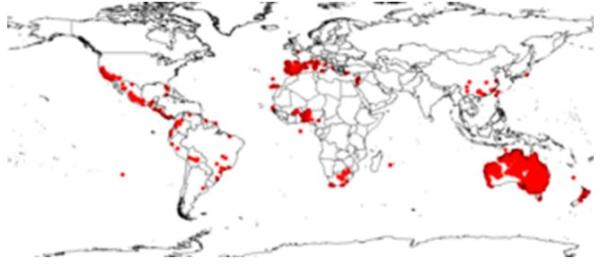 科学家们发现赤桉(eucalyptus camaldulensis),即红河胶(树),在澳大利亚各地都有生长。以下这张地图(图3),显示了它现在生长的所有地方。但请注意,这不是它的原生范围。它原本的生长范围只在这片大陆的东南部,但它现在几乎生长在这片大陆上的任何地方,无论是寒冷、炎热或干燥的环境,所以赤桉是非常好的一个品种。