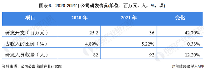 2021年公司研发开支总计3600万元,较2020年增长42.70%。研发支出占收入的比例从2020年的4.89%增长至2021年的5.22%。2021年研发人员数量增长10人,至92人。