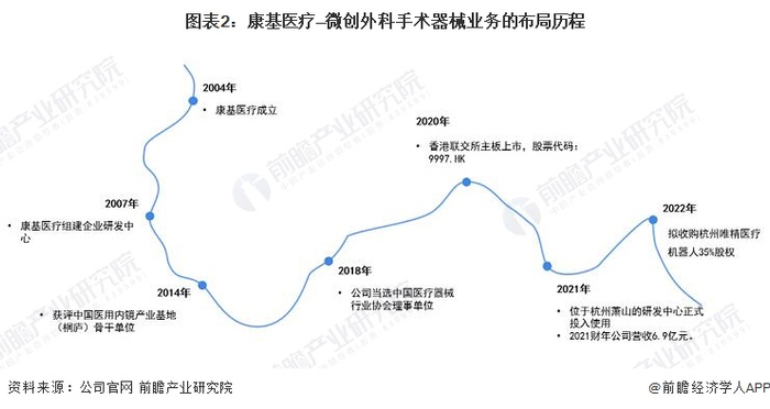 康基医疗成立于2004年,专注于微创外科手术器械及配套耗材(MISIA)的研发和生产。自成立以来,公司组建省级企业研究院、研发中心等,不断提升研发实力。2020年,公司在港交所上市,2021年公司实现营收6.9亿元。2022年1月,公司拟收购杭州唯精医疗机器人公司35%股权,拓宽其在手术机器人领域的战略布局。