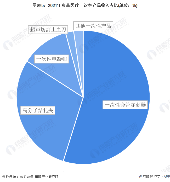 从各类型一次性产品营收占比看,2021年一次性套管穿刺器营收超过全部一次性产品的50%,占比达到54.84%。高分子结扎夹以29.23%的占比排名第二。一次性电凝钳收入占比也超过11%,排名第三。超声切割止血刀目前占比不足2%。