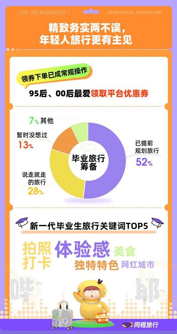 同程旅行在线调研显示,有超过半数的毕业生选择提前规划旅行,他们会根据自己的需求,结合平台消费券及产品价格,规划出最优的旅行路线,让旅行精致又充实。有趣的是,毕业生们在进行旅行规划时,更注重旅行体验感,适合拍照打卡、具有独特特色、美食、网红城市等标签都是毕业生规划旅行时的重要参考。