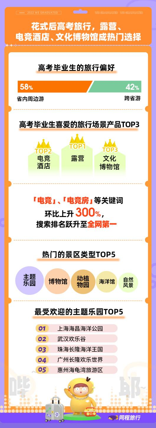 在旅行方式上,当代年轻人更愿意尝试考后放松的新玩法。根据同程旅行最新的在线调研,受疫情等因素影响,58%的高考毕业生倾向于本地周边游,露营、电竞酒店及文化博物馆是新一代毕业生最爱选择的旅行产品。数据显示,高考结束以来,同程旅行平台上的“电竞”“电竞房”等关键词搜索热度环比上升300%,搜索排名从稳居前五跃升至第一。《报告》显示,两天一夜或三天两夜的住宿标准是毕业生们的热门选择。在户外和三两好友相约露营地,将露营与剧本杀、狼人杀等多人游戏相结合,也是大部分毕业生的选择。