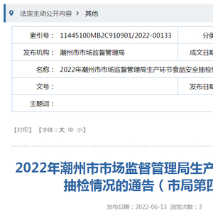 2022年广东省潮州市市场监管局生产环节食品安全抽检情况的通告(市局第四期)