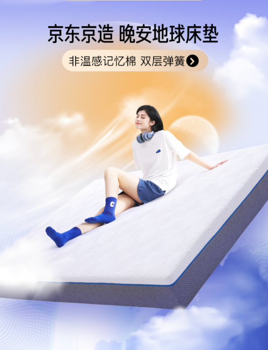 寝具是睡眠经济中最突出的部分,但消费者选购床垫往往是“花钱买经验”。而今线上购物盛行,床垫作为必须“用户体验至上”的产品,在线上购物时缺失了体验一环,也是造成“试错成本”原因之一;同时消费者对“好床垫”的标准认知不足,买床垫的“教育成本”无疑会更大。此外,消费者也逐渐意识到“深度睡眠”对于睡眠质量的决定性作用。以有效解决用户睡眠问题为核心,京东京造推出了更能帮助深睡的0压非温感记忆棉床垫——晚安地球床垫。