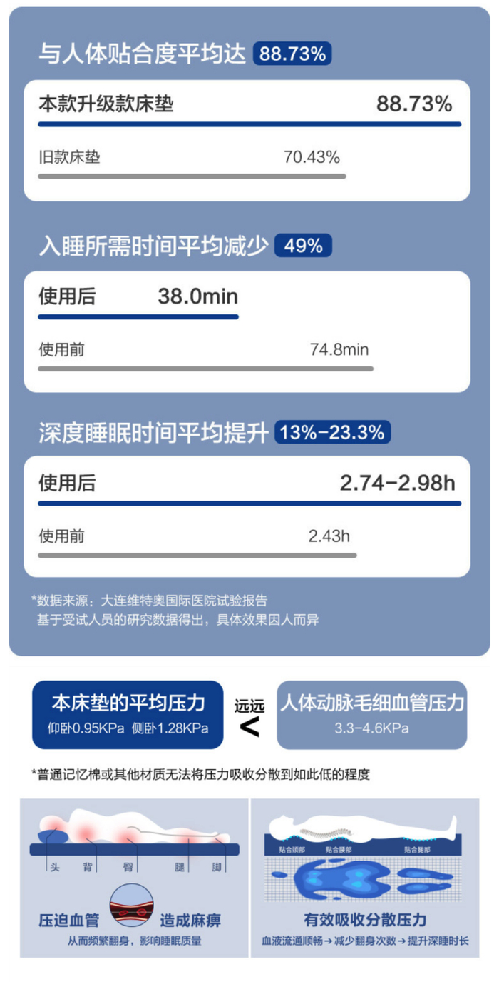睡得时间长并不一定睡眠质量高,确保足够的深度睡眠才至关重要。京东京造聚焦“深睡”,以数据为支撑,打造了能够更好地辅助用户深度睡眠的晚安地球床垫。