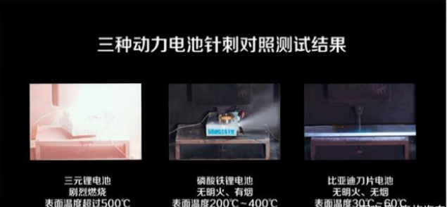 比亚迪公布的对电池进行的针刺实验中,“刀片电池”经过针刺也能保持在30-60℃之间,传统磷酸铁锂电池在被穿透后却有烟雾从电池卸压阀喷出,表面温度也达到了200℃-400℃。“刀片电池”即便在针刺实验中遇到短路情况,由于回路较长,表面积大且散热快,最终不会引起电池温度急剧升温的情况出现。