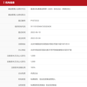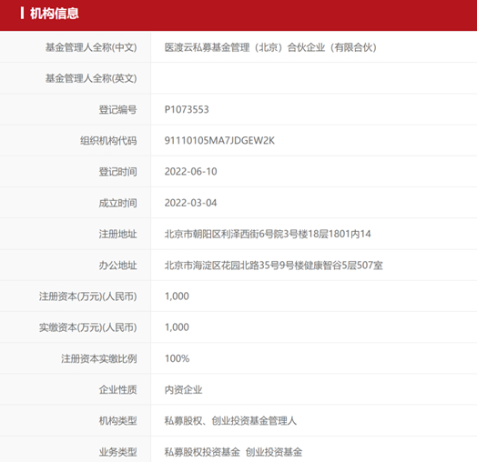 近日《每日经济新闻》记者获悉,中国证券投资基金业协会(以下简称中基协)公布了最新一批完成备案的私募基金管理人名单。其中,医疗AI龙头企业医渡科技实控的医渡云私募基金管理(北京)合伙企业(有限合伙,以下简称医渡云基金)于今年3月4日成立、6月10日完成备案,成为医疗上市企业设立私募子公司、布局股权投资大军中的一员。