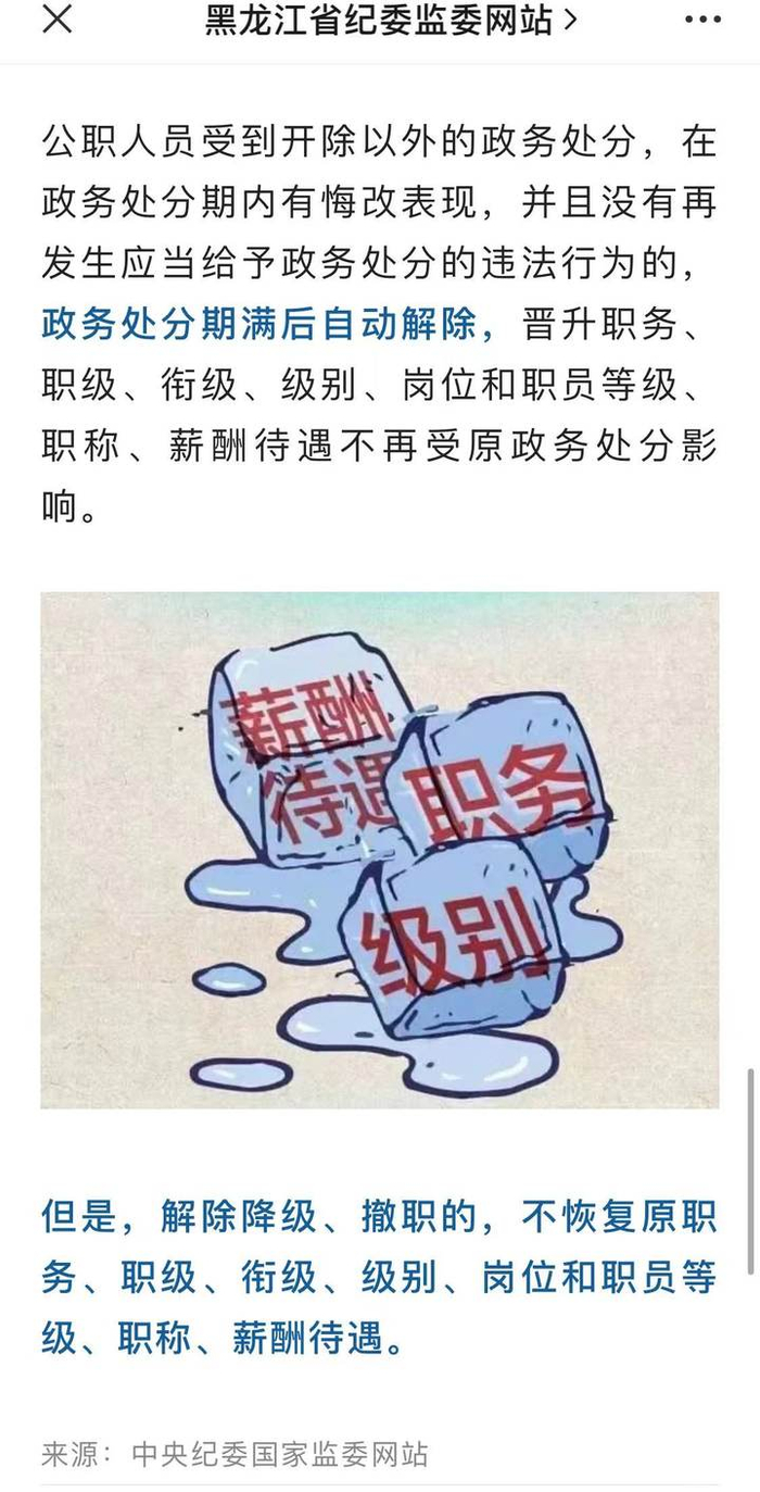 也就是说,松北区交通局运管站站长刘平和(非中共党员)在2019年被政务撤职处分,处分影响期为两年,政务撤职处分解除后,按《政务处分法》规定,“不恢复其原职务。”但是,“晋升职务、职级、衔级、级别、岗位和职员等级、职称、薪酬待遇不再受原政务处分影响。”