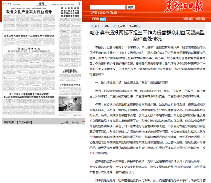 2019年,据黑龙江日报报道,哈尔滨市通报两起“不担当不作为侵害群众利益问题典型案件”查处情况: