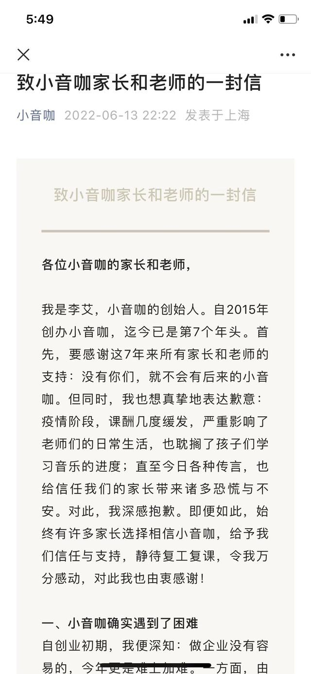 6月13日晚22时许,小音咖创始人李艾在官方公众号发出一封《致小音咖家长和老师的一封信》,在信中,李艾坦承遇到了“资金紧张、运营困难”,并制定了“纾困计划”,承诺“尽力保障愿意接受复课且新增耗课老师的课酬先以打折的方式支付,剩余部分分期进行支付”,“参与纾困计划的老师,针对其历史未发放的课酬,制定分期支付方案,分批兑付”,同时希望家长“暂缓退费”。