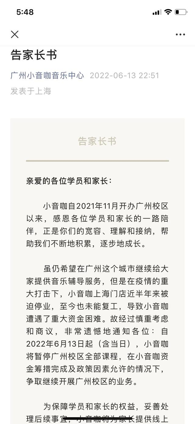 更令小音咖教师们担忧的是,就在李艾这封信发布后不久,广州小音咖音乐中心通过官方公众号宣布,自6月13日起将暂停广州校区全部课程,对于后续安排,表示“资金筹措完成后争取继续开展广州校区的业务”。