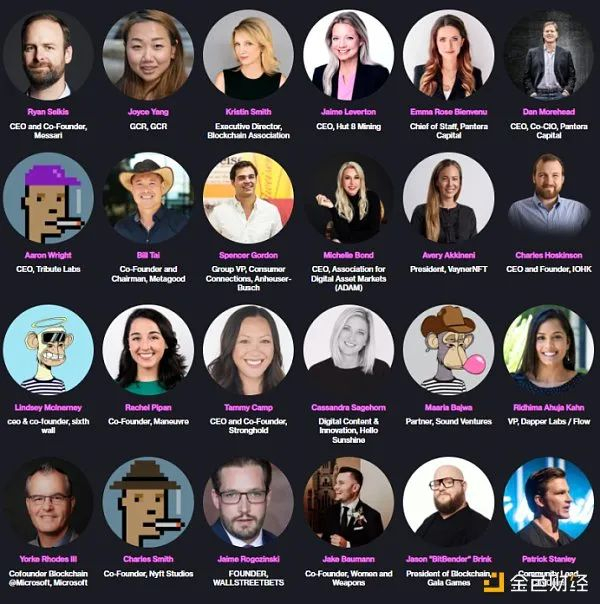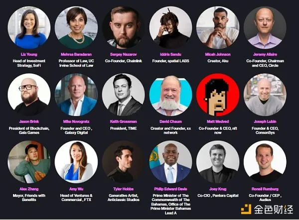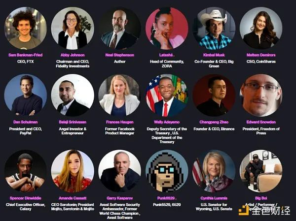 演讲者包括FTX首席执行官Sam Bankman-Fried、富达投资董事长兼首席执行官艾比·约翰逊、作家尼尔史蒂芬森、ZORA 社区负责人Latashá 、Big Green联合创始人兼首席执行官Kimbal Musk、CoinShares首席安全官、贝宝总裁兼首席执行官、天使投资人和企业家巴拉吉·斯里尼瓦桑、前脸书产品经理、美国财政部副部长、币安创始人兼CEO赵长鹏、新闻自由主席爱德华斯诺登……