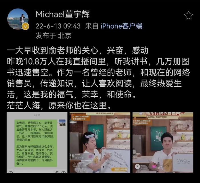 但自从开启双语带货以来,直播间迅速升温,并占据微博热搜。6月13日,俞敏洪在凌晨向董宇辉发微信表达感谢,董宇辉回复称:“一大早收到俞老师的关心,兴奋,感动。昨晚10.8万人在我直播间里,听我讲书,几万册图书迅速售空。作为一名曾经的老师,和现在的网络销售员,传递知识,让人喜欢阅读,最终热爱生活,这是我的福气,荣幸,和使命。茫茫人海,原来你也在这里。”