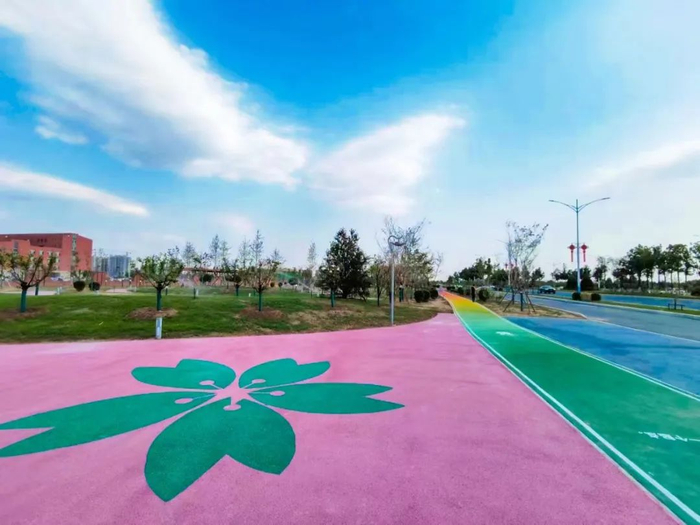 相比国内绝大部分公园的红色塑胶跑道,以及极少的彩色跑道,清樱园这条跑道全长300米,以草绿、明黄、橙色、紫色、海蓝色、洋红等颜色为主,混合搭配出150余种过度色,进而制作而成。该跑道具有低头单一色,抬头渐变色,鸟瞰彩虹色的特点,在满足居民健身需求的同时,成为公园一道靓丽的风景线。