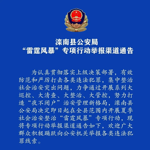自6月12日起,滦州市在全市开展夏季社会治安“雷霆风暴”专项整治行动。现将专项整治行动举报内容、举报方式、举报须知公告如下: