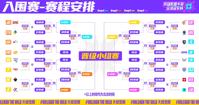 以WRL赛区为例,首届WRL职业联赛冠军FPX作为赛区1号种子直接进入小组赛C组,JDG、NV和JT则进入到入围赛的B、A、C 组,入围赛共16支战队将决出8个名额进入到小组赛,小组赛分为四组,小组前二晋级,最终八支队伍进入淘汰赛。