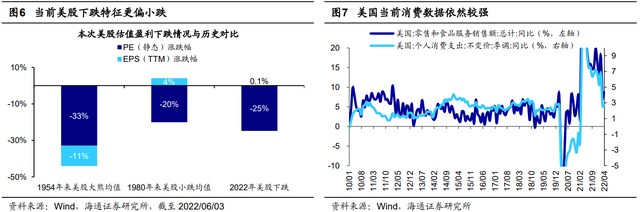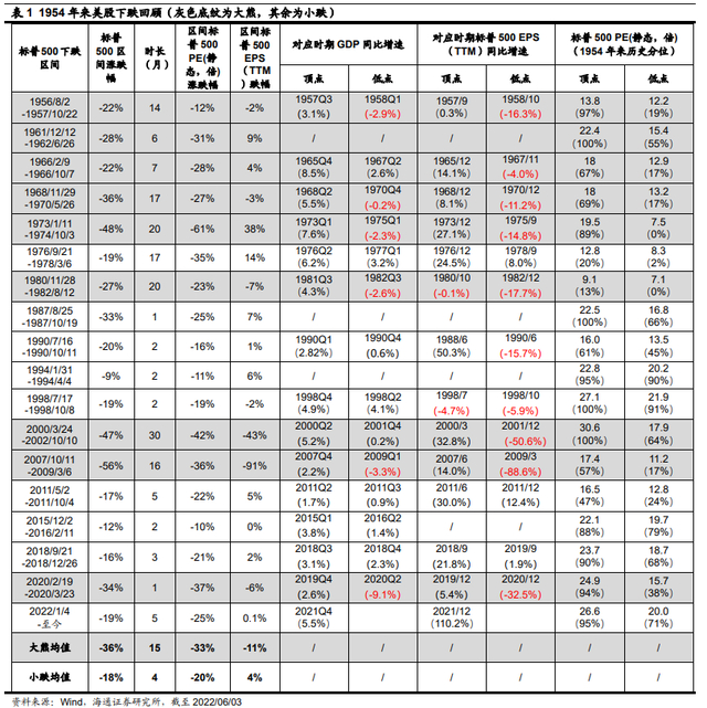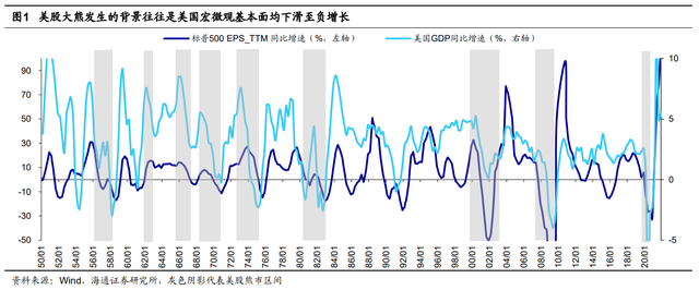 综合来看,历史上美股明显下跌时的共同特点为下跌前估值往往处于高位,且基本面均存在下行压力,而要判断美股下跌究竟属于小跌还是大熊,关键在于区分美国的宏微观基本面最终是没有明显衰退的“软着陆”,还是连续维持负增长的“硬着陆”。因此当我们将标普500指数涨跌幅进一步拆分为估值和盈利两方面时,可以发现美股小跌时标普500 PE平均涨跌幅为-20%(中位数为-20%,下同),同期EPS的平均涨跌幅为4%(3%),而美股发生大熊级别下跌时标普500 PE平均涨跌幅为-33%(-31%),EPS平均涨跌幅为-11%(-3%),即历史上美股的小跌主要源于小幅增长的盈利无法对冲大幅下跌的估值,而美股大熊则是估值和盈利共同下滑的结果。