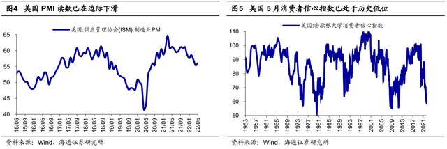 当前美国宏微观基本面均存在下行压力。在美联储政策收紧的同时,当前美国宏微观基本面均存在下滑的趋势。宏观数据方面,22Q1修正后的美国实际GDP已环比下滑1.5%,而4-5月的PMI数据显示美国的经济增长动能仍在放缓:今年4月美国ISM制造业PMI已经从3月的57.1%下滑至55.4%,虽然在5月小幅回升至56.1%,但美国今年4、5月PMI读数均处于20年9月以来的最低水平。此外截至5月28日美国5月的消费者信心指数已经降至58.4%,接近1953年以来的历史最低点,表明了消费者对未来的预期已较为悲观。