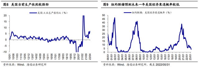 短期内美国基本面衰退概率较低,因此本次美股下跌演变为大熊的概率也较小。此外从基本面的角度分析,历史上美股走熊的标志是美国宏微观基本面衰退至“硬着陆”,其中GDP同比负增的现象平均会持续约2个季度,而目前来看短期内美国经济走向这种“硬着陆”的概率还不大。宏观数据方面,美国ISM 制造业PMI读数虽然在边际下滑,但维持在50%以上的扩张区间,且当前美国的消费和生产仍较为强劲:4月美国零售销售额同比增长8.7%,环比增长0.9%,剔除通胀影响后的个人实际消费支出同比增长2.8%;4月美国工业产值同比增长7.0%,环比增长1.2%。根据纽约联储的预测,美国未来12个月经济衰退的概率整体处于10%以下,而在01年、08年、20年时该概率均超过了30%。微观盈利方面,标准普尔公司数据显示目前22Q1标普500的EPS(TTM)为198美元/股,而22Q2/Q3/Q4的预测值分别为200、205、207美元/股,对应同比增速为26%/17%/5%,虽然边际下滑但仍维持正增长。