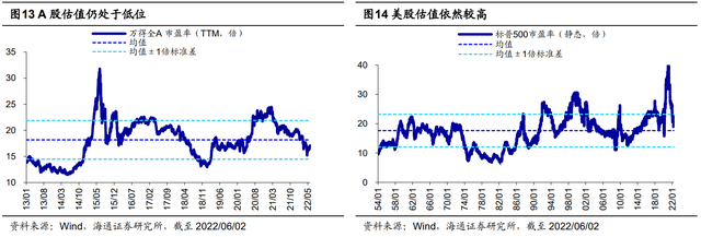 为何近期美股明显下跌时A股依然能保持韧性?我们认为这背后主要源自于中美两国的经济周期错位,以及中美股市估值所处的位置不同:根据我们改进版的投资时钟框架,目前美国仍处在经济增长动能下滑而通胀高企的滞胀期,同时在政策上还面临美联储紧缩的压力,而我国已经处于政策托底经济的衰退后期,因此A股的宏观环境要优于美股,详见《A股与美股的逆向-20220522》;在市场微观结构方面,目前(截至2022/06/02,下同)A股的估值仍处于低位,万得全A的PE(TTM)处于2013年两轮牛熊周期以来的37%历史分位,而美股的估值依然处于中等偏高水平,标普500的PE(静态)处于1954年四轮牛熊周期(1990年两轮牛熊周期)以来的71%(50%)历史分位,因此估值位置的差异也在一定程度上解释了为何近期美股和A股走势开始“逆向”。