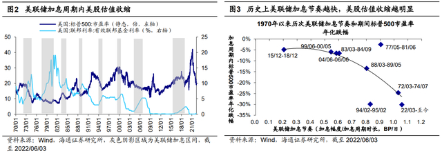 本轮美联储加息导致美股估值明显收缩。具体来看,估值方面,本轮美股下跌前标普500的PE已处于1954年以来95%的历史高位。而年初至今除了俄乌冲突这个外部因素以外,导致本次美股估值明显下滑的重要原因便是美联储开启了政策紧缩周期。我们统计了自1970年代美国大滞胀时期以来的美联储加息周期,发现在加息期间内美股估值均会出现不同程度的收缩,且估值收缩的幅度和美联储加息的节奏相关:以加息幅度/加息周期时长来刻画历轮美联储的加息节奏,可以发现通常美联储加息节奏越快,相同时间内标普500的PE下降幅度就越大。而在这一轮紧缩周期内,美联储于今年3月宣布上调基准利率25个BP,随后5月再次宣布上调50BP,是1970年以来最快的加息节奏,且为了有效控制通胀,未来美联储仍有可能多次大幅加息,因此本轮标普500的估值收缩很明显,年初以来标普500 PE下降约25%。