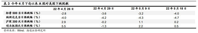 历史上美股下跌时A股往往同步跌,但近期A股已和美股“逆向”,源于经济周期和股市估值位置不同。从A股的角度来看,美股市场的持续走弱是否会影响A股市场?其实历史上A股和美股整体相关性不高,1991年以来上证综指和标普500滚动3个月的相关系数均值为0.17, 2014年11月沪港通开通后该相关系数的均值也仅为0.40。但美股下跌对A股的影响较大,14年11月后美股出现跌幅10%以上的下跌时A股的走势往往会遭受拖累(详见表2)。就本次而言,去年底以来受俄乌冲突和全球流动性收紧等因素影响,去年12月至今年4月A股和美股普跌,但4月下旬以来美股经历了多次单日跌幅超过3%的急跌,而次日A股表现却与美股背道而驰,可见近期A股已开始对美股下跌脱敏(详见表3)。