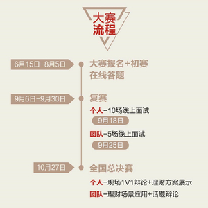 全国总决赛将于 10 月 27 日在线上举行,新浪财经将对比赛全程做在线直播,十强选手需在线上进行专业技能比拼,接受评委考核,角逐冠、亚、季军。个人赛总决赛共两个环节:理财开杠赛+拜托了,理财师。