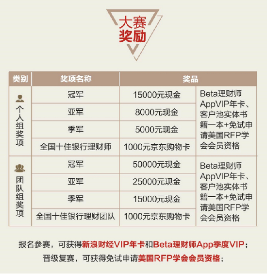 大赛复赛结束后,将根据个人赛和团队赛中各银行入围的选手数量和选手成绩,按综合成绩排名选出五家银行颁发“卓越理财师培育奖”。