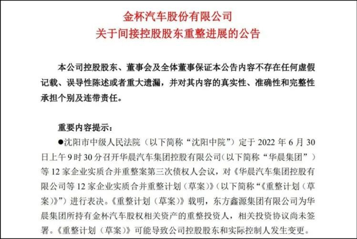 近日,金杯汽车(SH600609,股价5.52元,市值72.38亿元)发布公告称,沈阳市中级人民法院(以下简称沈阳中院)定于2022年6月30日上午9时30分召开华晨汽车集团控股有限公司(以下简称华晨集团)等12家企业实质合并重整案第三次债权人会议,对《华晨汽车集团控股有限公司等12家企业实质合并重整计划(草案)》(以下简称《重整计划(草案)》)进行表决。