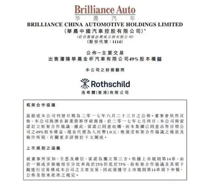 不过,雷诺虽然只花了1块钱买了华晨金杯49%股权,但现实代价是向华晨金杯注资15亿元,而这笔钱的真正作用显然就是帮助金杯汽车在年度财报中“扭亏为盈”(当时华晨金杯负债总额高达107亿元)。