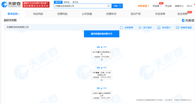 天眼查APP显示,欢喜传媒还分别于2003年、2015年在香港成立欢喜娱乐(香港)有限公司、欢喜影视投资有限公司。而欢欢喜喜,正是欢喜影视投资公司控股孙公司。