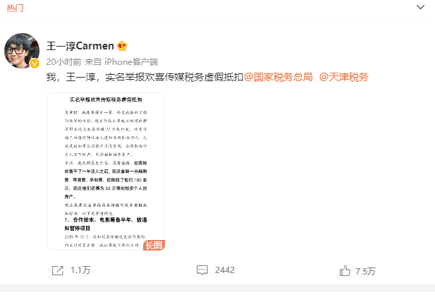 6月14日,#王一淳举报欢喜传媒税务虚假抵扣#、#欢喜传媒回应#两词条登上微博热搜。双方当事人就合同争议、税务虚假抵扣等问题在微博上你来我往、各执一词。