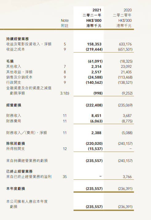 但到了2021年,公司收入就骤降至1.58亿港元,同比大幅减少约75%;净亏损约2.36亿港元,同比减少0.35%;每股亏损0.07港元。而2021年,欢喜传媒并没有拿得出手的作品。