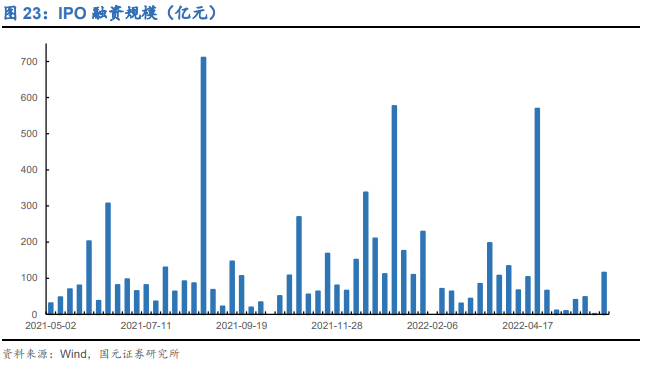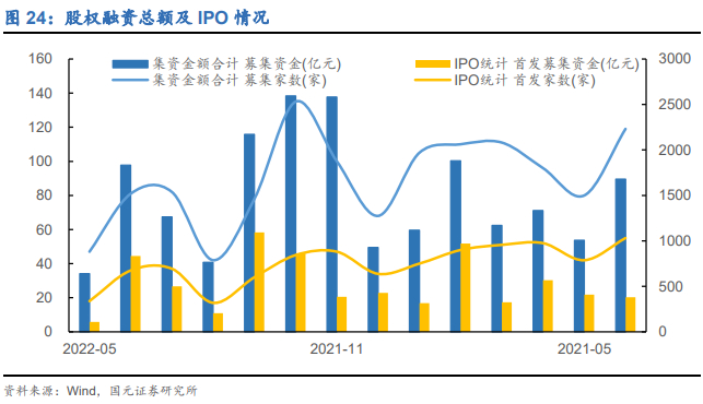 回顾股权融资总体情况,2022年以来,5月募资总额为639.47亿元,处于低位,目前来看6月份股权融资和IPO规模较5月均有望进一步提升。