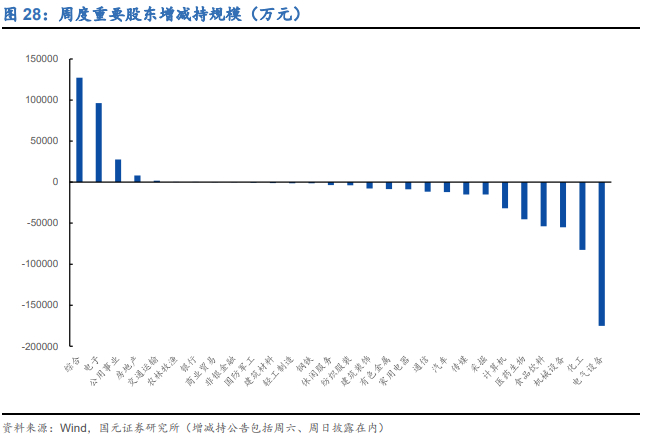 产业资本——重要股东增减持:上周重要股东净减持27.43亿元,前一周净减持约51.28亿元。上周减持规模前五的行业为电气设备、化工、机械设备、食品饮料、医药生物。