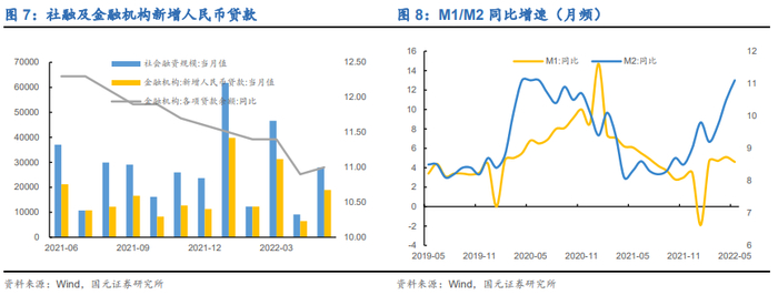 2022年5月,M1增速4.6%(前一期5.1%);M2增速11.1%(前一期10.5%)。2022年5月新增社融2.79万亿元(前一期约9102亿元),金融机构新增人民币贷款1.89万亿元(前一期约6454亿元)。可见货币供应数据尚可,5月人民币贷款增长和信贷需求有所回升。