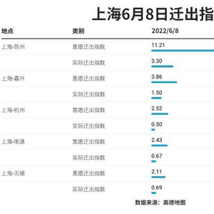 而在其他出行方面,根据高德地图的迁徙大数据,苏州、嘉兴、杭州、南通、无锡五个长三角城市与上海的人口流动关系最为密切,而与2021年同期相比,今年上海到这些城市的意愿迁出指数和实际迁出指数都有所降低。