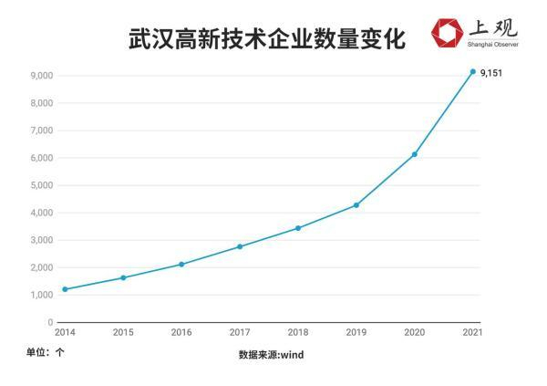 当然,并非所有的GDP增长都能和人口流入挂钩,但武汉GDP增长的主要动因还是工业的增长与优化。2021年武汉工业增加值同比增长14.2%,是近9年以来的最快增幅。值得一提的是,高新技术企业数量成倍增长。2018年,高新技术企业数量为3438个,而到了2020年,已增加至6131个;2021年更是增加至9151个,相比2018年翻了2.66倍。2021年,武汉高新技术企业数量位居全国第八,中西部第一。