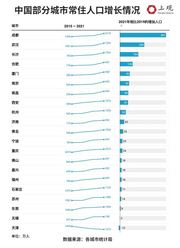 不过,疫情后,二线城市的人口流入开始出现分化,从地区上来看,中、西部城市近两年人口吸引力增强,除武汉外,成都、长沙、南昌人口快速增长。