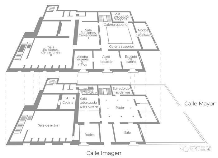 塞万提斯故居博物馆位于古代繁华商业区的主街,街道两旁是传统骑廊式建筑,分上下两层,底部用石柱支撑,在石柱与第二层民居建筑之间由横木衔接。以前这里便是商贩们售卖自己商品的摊位。