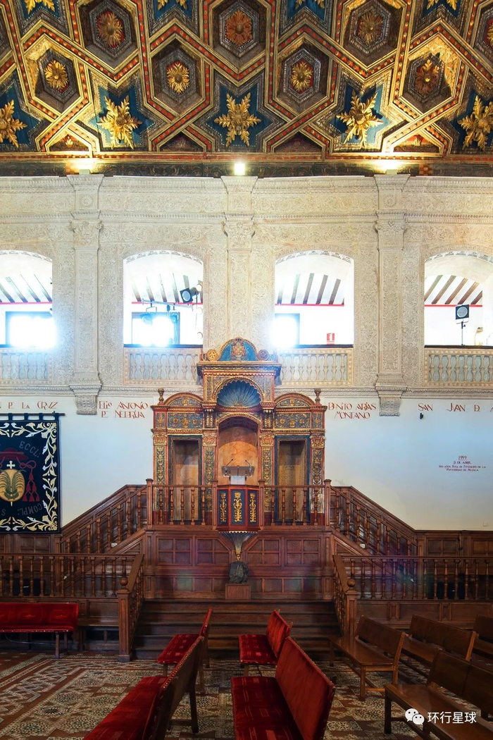 这座大厅曾经也是学生们进行答辩的地方,位于一侧的答辩台真实地还原了当时的场景。值得一提的是,在1785年这里见证了西班牙历史上第一位女博士的诞生。在建校至今长达500多年的历史长河中,它为西班牙乃至整个西语世界源源不断地输送了大批各领域人才。