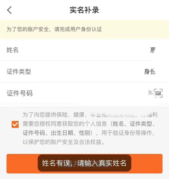 他在保险App上输入姓氏,系统无法识别。
