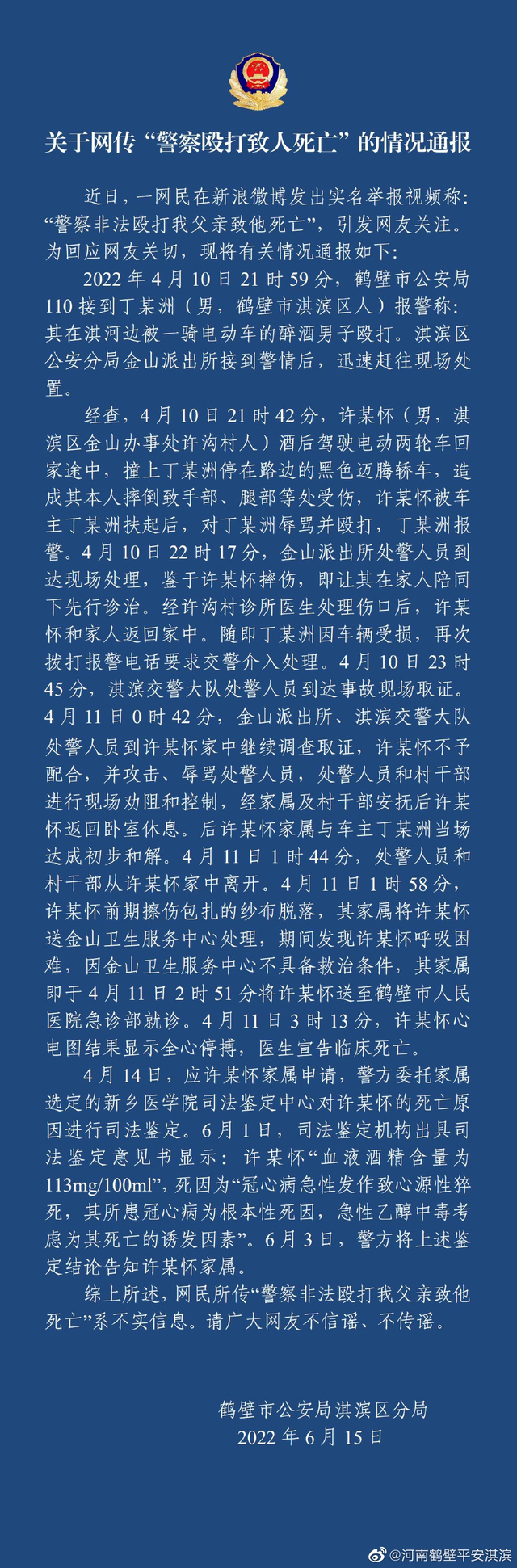 6月15日,河南省鹤壁市公安局九州派出所发布通报称:网传“警方非法殴打我父亲致他死亡”系不实信息。司法鉴定意见书显示:许某怀“血液酒精含量为113mg/100ml”,死因为“冠心病急性发作致心源性猝死,其所患冠心病为根本性死因,急性乙醇中毒考虑为其死亡的诱发因素”。警方已于6月3日将上述鉴定结论告知许某怀家属。