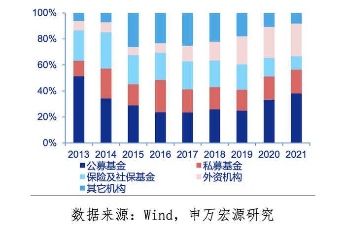 资本市场机构化趋势越来越明显,机构投资者话语权提升。资本市场的系统性改革极大推进了专业投资机构的发展,其持股占比从十年前的15%左右显著提升至目前20%-25%的水平。机构投资者中,公募、外资、私募和保险成为四大支柱,累计占比超过90%。尤其是,在偏股型公募基金高速增长的推动下,2021年公募基金持股市值达到6.4万亿元,在专业投资机构中的比例上升至38%。公募基金成为国内最大的专业投资机构,市场话语权较高,很大程度上主导了A股市场结构性特征。