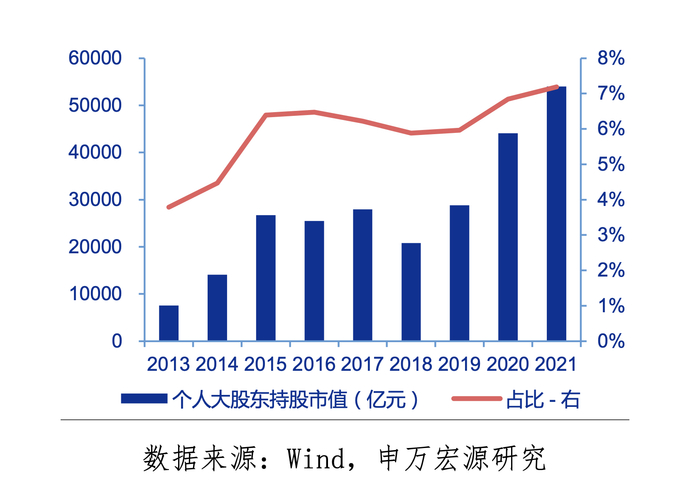 个人大股东在A股市场快速崛起。近年来随着注册制改革试点的推进,资本市场服务逐步下沉,市场入口逐步向企业生命周期前期的企业开放,推动以高端人才为代表的智能资本和知识资本快速发展,并成为影响企业经营和资本扩张的重要力量。这在A股股权结构上体现为中小企业的创始团队成员大批成为上市公司的个人大股东,个人大股东持股比例不断创新高。2021年末A股上市公司个人大股东(前十大流通股中的个人)持股市值达到5.4万亿元,占A股流通市值之比达到历史最高的7.2%。而从第一大流通股东的情况来看,个人大股东持有流通市值1.8万亿元,占A股流通市值的2.0%,较之前也有进一步提升。
