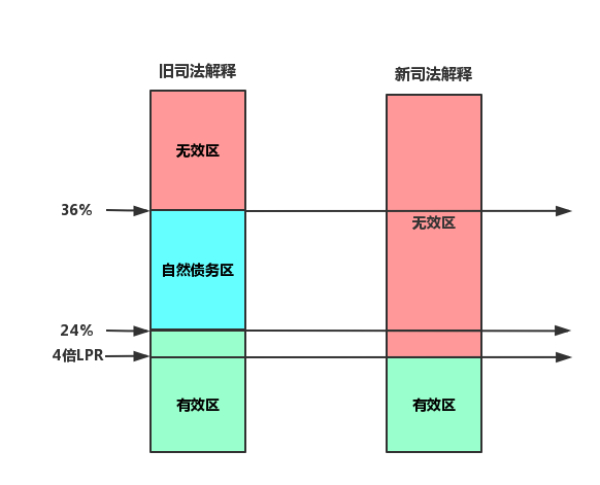2015年9月1日起,《最高人民法院关于审理民间借贷案件适用法律若干问题的规定》开始施行,其中第二十六条规定,“借贷双方约定的利率未超过年利率24%,出借人请求借款人按照约定的利率支付利息的,人民法院应予支持。借贷双方约定的利率超过年利率36%,超过部分的利息约定无效。借款人请求出借人返还已支付的超过年利率36%部分的利息的,人民法院应予支持。”