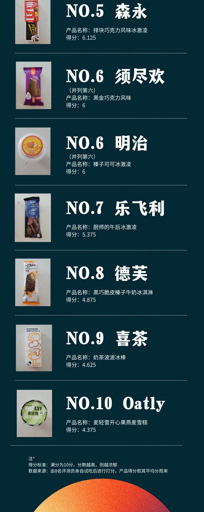 而大家表示愿意多吃几口以及剩余块数在4块以下的有1号钟薛高、3号伊利、7号森永、8号Oatly和10号喜茶,其中1号钟薛高和8号Oatly一块没剩并得到最多好评,因此得分最高。