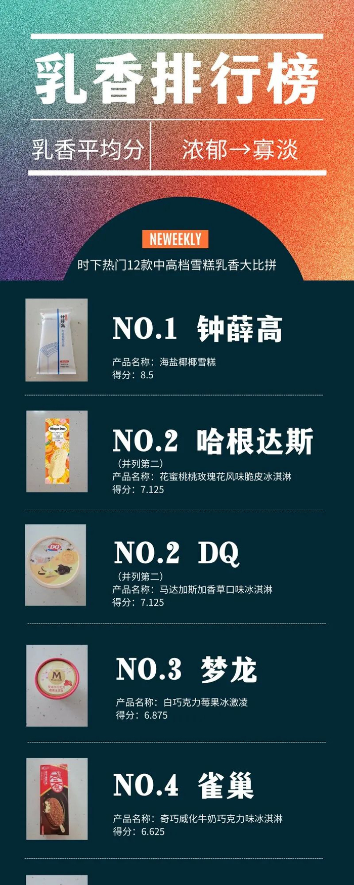 本次参与测评的12位选手在乳香PK中,1号钟薛高、4号哈根达斯和6号DQ入围前三,成为唇齿留香的典范。
