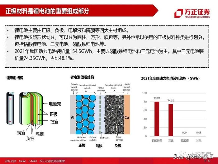 锂电池主要由正极、负极、电解液和隔膜等四大主材组成。锂电池按照形状划分,可以分为圆柱、方形、软包等。另外也常以使用的正极材料种类进行划分, 包括钴酸锂电池、三元电池、磷酸铁锂电池等。2021年我国动力电池装机量154.5GWh,主要以磷酸铁锂电池和三元电池为主。其中三元电池装 机量74.35GWh,占比48.1%。