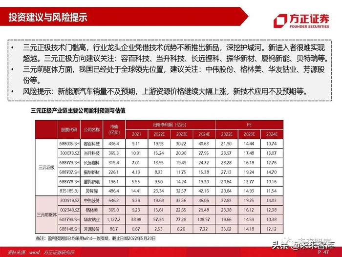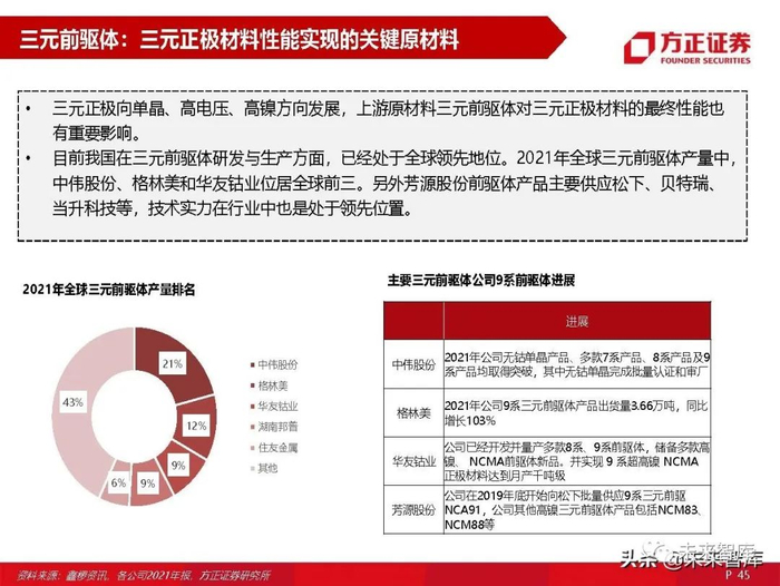 三元正极向单晶、高电压、高镍方向发展,上游原材料三元前驱体对三元正极材料的最终性能也 有重要影响。目前我国在三元前驱体研发与生产方面,已经处于全球领先地位。2021年全球三元前驱体产量中, 中伟股份、格林美和华友钴业位居全球前三。另外芳源股份前驱体产品主要供应松下、贝特瑞、 当升科技等,技术实力在行业中也是处于领先位置。